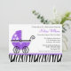 Um convite de chá de fraldas para uma menina zebra com carruagem de bebê roxo e impressão de zebra. Personalize facilmente o seu chá!