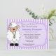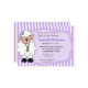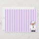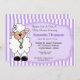 Um lindo borrego de bebê com pacificador no pescoço. O fundo tem listras roxas e uma caixa de texto roxa.