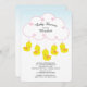 Um convite para chá de fraldas de borracha, bonito, apresentando uma nuvem branca com adoráveis patinhos amarelos de menina em um fundo azul-ombre. Sacudir nosso chá de fraldas moderno e contemporâneo convida a ver um plano de fundo correspondente para um toque especial extra. Escolha perfeita para um chá de fraldas feminino. Adorava este esquema de design? Visite nosso compro para ver outros temas populares de chá de fraldas.