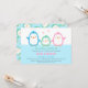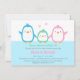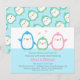Um pequeno está a caminho de fazer dela uma família de três! Convide amigos e família para celebrar esta maravilhosa ocasião com este convite de chá de fraldas simples e giro! Apresenta uma família de pinguins feliz de três com proporções de ovo, pai, bebê e mamãe em azul, verde e rosa, respectivamente. O contrário é um padrão feito com pinguins bebês que estão segurando asas. Adivinha o gênero do bebê! Excelente de bebês chegando no período de inverno de dezembro. Personalize com seus detalhes de chá de fraldas.