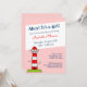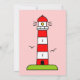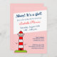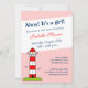 Convites para bebês náuticos| farol. O transporte marítimo cor-de-rosa bonito convida com torre de casas leves e desenho de desenhos animados de aves marinhas. design de ilustração de cena costeira para bebê recém-nascido.