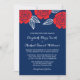 Rosas vermelhas brancas e brancas em um fundo azul marinho decoram este convite de casamento moderno.