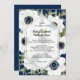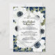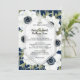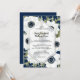 Flores elegantes de anêmona preto e branco e deixa aquarela em um fundo azul marinho e detalhes de sua cerimônia de casamento em caracteres chicos em uma camada transparente de diamante branco. CORRESPONDENDO a itens na nossa loja.