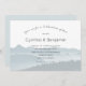 O convite para o casamento de Mountain Ridge para uma "celebração do amor". Tema da natureza, com montanhas cinzas-azuis e uma floresta de árvores ao fundo. Fontes modernas com um script casual curvo no topo pedindo aos convidados para "se juntarem a nós". Os primeiros nomes da noiva e do noivo estão em letras grandes impressas. Use letras maiúsculas, deixando espaços entre as linhas, para obter informações sobre cerimônia. Design reverso é um padrão de cinza azul.