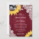 Este convite floral de casamento com girassóis contra um fundo de madeira de celeiro enfeitado com luzes de cordas e rendas florais brancas é perfeito para convidar seus convidados para sua festa de casamento vermelha rustica inspirada por girassóis. Fácil de personalizar modelo. design totalmente personalizável.