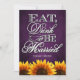 Coma Drink & Be Casried Chalkboard Sunflower Wedding Invitations — combina com as cartas RSVP e mais informações encontradas abaixo nesta página. Cumprimente seu tema de casamento de girassol com estes convites que apresentam uma textura de quadro de chalkboard roxa como um fundo com Comer, Beber e Casar-se em um roteiro elegante com girassóis vibrantes no fundo da frente e atrás de cada convite. Estes convites para o casamento são feitos com um cartão básico de alta qualidade; entretanto, você pode mudar o estoque para linho, feltro (gravado), reciclado e várias tonalidades metálicas se quiser com o número 2 (escolha seu estilo, tamanho e tipo de papel) abaixo do botão laranja adicionar ao carrinho. Também nessa opção é apresentada uma lista dos custos adicionais de uma reserva de cartão mais antiga. Cada convite tem um envelope branco. Veja os cartões RSVP de casamento correspondentes abaixo para completar a suíte.