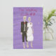 Para um casamento divertido de Halloween, aproveite a pintura bonita de um casal de esqueleto. o noivo está vestindo um smoking preto com uma gravata vermelha de arco e a noiva está vestindo um vestido branco de noiva com uma flor vermelha. A design é impressa em convites de casamento que você pode personalizar facilmente nos formulários de modelo. Obrigado por comprar CherylsArt no Zazzle.