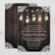 Barn Wood e Lace Mason Jar Wedding Invtions - apresentam luzes de cordas e jarras de pedreiro iluminadas sobre um fundo de madeira de celeiro com fontes elegantes. Consulte a coleção de correspondência de cheios neste design nesta página.