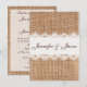 Rustic Country Burlap Wedding Invtions com uma faixa de renda impressa e o nome da noiva e noiva que o atravessa está em um dos lados deste convite para casamento. O outro lado também tem o fundo do impressão da sobreposição e os detalhes do convite para casamento estão em cima de uma camada branca transparente para que você possa ler o texto mais facilmente. O texto é marrom. Se você quiser mudar as cores da fonte ou mover as coisas, use o botão "Personalizar".
