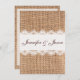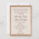 Rustic Country Burlap Wedding Invtions com uma faixa de renda impressa e o nome da noiva e noiva que o atravessa está em um dos lados deste convite para casamento. O outro lado também tem o fundo do impressão da sobreposição e os detalhes do convite para o casamento estão em cima de uma camada branca transparente para que você possa ler o texto mais facilmente. O texto é marrom. Se você quiser mudar as cores da fonte ou mover as coisas, use o botão "Personalizar".
