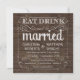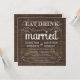 Coma, beba e seja casado — convites de casamento rústicos, ao estilo da vintage — Rolamentos suaves, encaracolados e tipografia de moda antiga em fundo de madeira marrom. Adicione seus nomes e informações de casamento neste modelo fácil de usar. O elegante, mas divertido e caprichoso, escrevendo de script de estilo chalkboard pode ser modificado para o seu tema de casamento formal ou semiformal. O estilo de convite ao conselho de giz quadrado é perfeito para casamentos modernos modernos modernos modernos, com um toque divertido de charme sofisticado e romântico para a noiva e o noivo tradicionais. Entre em contato conosco para obter ajuda com a personalização se precisar de espaço adicional para os detalhes do casamento. Cartões de convite quadrados requerem postagem extra — outros tamanhos e estilos de quadro de correspondência disponíveis.