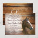 Este convite para o casamento no oeste do país rústico tem um belo cavalo colorido de castanha sobre um fundo de madeira castanha escura e aflita. O verso do convite tem o mesmo design de madeira de celeiro no estilo do país rústico com a palavra "Amor" na escrita. Você poderia mudar esta redação para personalizá-la com os nomes da noiva e do noivo se quisesse. (Use o botão Personalizar) Estes convites para casamentos temáticos do país são perfeitos para casamentos de vaqueiro, noivas e noivos que andam ou exibem cavalos, e qualquer um que seja uma vaqueira ou ame cavalos, ou tenha um casamento temático de cavalo, fazenda, celeiro ou fazenda.