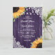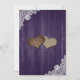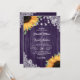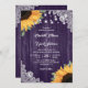 Convites de casamento floral rústico púrpura inspirados em girassóis, madeiras rústicas, burlap e rendas.