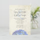 Modelo de convite de casamento de flor azul hydrangea. Script e fontes impressas com nomes guardados com um grande sinal "e" em azul claro. Uma flor azul clara decora o fundo do papel de 5 x 7 polegadas, com muitas atualizações oferecidas. O fundo é um tom de sepia com flores hipnórdicas ilustradas.