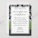 Convites para casamento do Verde limão Black White Damask—correspondem às placas RSVP e mais foram encontrados abaixo nesta página. Cada convite contém um design de borboleta floral preto e branco impresso. A frente também apresenta uma banda decorativa de verde limão impressa com uma fivela de diamante aparada. Estes convites para o casamento são feitos com um cartão básico de alta qualidade; entretanto, você pode mudar o estoque para linho, feltro (gravado), reciclado e várias tonalidades metálicas se quiser com o número 2 (escolha seu estilo, tamanho e tipo de papel) abaixo do botão laranja adicionar ao carrinho. Também nessa opção é apresentada uma lista dos custos adicionais de uma reserva de cartão mais antiga. Cada convite tem um envelope branco.