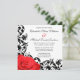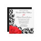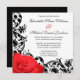 Bonito convite de casamento para rosa gótica. Apresentando uma rosa vermelha clássica com elegantes espirais floridas sobre fundo preto. Flourados por © Mujka Design
