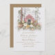 Bela floresta Woodland com pinheiros, celeiro vermelho ou cabana, e curvas neutras, verde-macio, amarelo-mostarda e pálidas folhagem e flores secas em um fundo falso e muito leve de cinzas. A parte de trás é um plano de fundo acastanhado neutro. Perfeito para um casamento com uma sensação do lado da montanha da natureza. Muitos itens correspondentes em um!