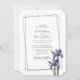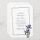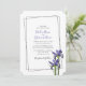 Este elegante design floral apresenta íris roxos. Os belos íris roxos com seus caules verdes são colocados sobre uma borda geométrica fina. Os nomes da noiva e do noivo são da cor correspondente ao roxo da flor da íris. No verso é utilizada uma imagem maior das elegantes flores da íris. Este é o perfeito design de casamento floral ideal para qualquer tema de casamento. Design de convite para casamento da íris com elementos modernos. Também estão disponíveis itens de papelaria de casamento e outros formatos de convite de casamento.