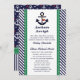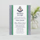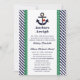 Convites de casamento de âncora verde e marinho com tema náutico. Marinho e borda listrada branca com uma design de aparência de fita costurada, rosa e branca, e uma âncora com uma estrela e um coração vermelho pendurados numa corda amarela. Este design é perfeito para um primavera ou casamento de verão no oceano ou praia. Personalize a parte frontal e traseira deste cartão para dizer o que você quiser. Trabalho de arte © Chrissy H. Estúdios, LLC. Todos os direitos reservados.