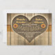 Convite para casamento estilo na moda ou ocidental com fundo de madeira, coração de madeira e girassóis.