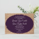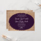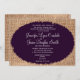 Este convite de casamento rústico é perfeito para qualquer casamento no interior oeste. Apresenta um fundo arrombado impresso em cada lado do convite. A letra do convite é impressa em um oval roxo esfarrapado. O burlap é apenas um design impresso. Não é um tecido de burlap. Este anúncio de casamento é perfeito para o casal que está tendo um casamento no interior oeste ou no celeiro e cujas cores de casamento são roxas e arrombadas.