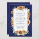 Convites para Casamento Russo Real de Girassol - apresenta girassóis elegantes de aquarela com verde claro entrelaçados sobre uma caixa de texto única. O fundo é um design de quadro azul real ou profundo.