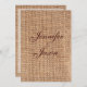 Convites para Casamento de Impressão de Burlap, em Rustic Country, que são perfeitos para um casamento no estilo country. Estes convites para o casamento são um design de burlap impresso, não um tecido de burlap real. A design é de uma fotografia de alta resolução do tecido real da burlap, então, mesmo que seja apenas um convite impresso, eles se parecem com uma burlap real ou um tecido de juta. Eles têm o design de burlap impresso em ambos os lados do convite, em cor de cheio, sem custo adicional. Um lado tem os nomes da noiva e do noivo e o outro lado tem os detalhes da cerimônia de casamento. Você pode usar o botão "Personalizar" para alterar o estilo ou o tamanho da fonte ou adicionar ou excluir texto. Esses anúncios de casamento rústicos são uma maneira perfeita de anunciar seu casamento no país, casamento de vaqueiros, casamento rústico ou casamento rural. Estas parecem excelentes se você vai usar burlap em sua decoração de recepção de casamento ou está acentuando qualquer parte do seu casamento com burlap.