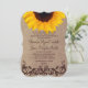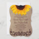 Tem uma forma de colchete de recorte para um convite de casamento único. O fundo é um impressão de papel vintage angustiado com um aspecto ligeiramente texturizado. Tem um impressão de rolagem de vinha floral ornamentado no fundo do convite. O topo do convite apresenta um grande girassol amarelo brilhante com belas pétalas de flores amarelas. Esses convites para casamento de girassol rústico são perfeitos para casamentos no campo, casamentos de celeiro, casamentos de fazenda, casamentos de vaqueiro, casamentos rústicos, e qualquer um que esteja usando girassóis em seu buquê de casamento ou decoração de recepção de casamento.