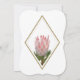 Esta design apresenta uma flor de proteína rústica rosa. A flor da proteína rei com suas folhas verdes é elegantemente emoldurada com uma estrutura de cor de diamante dourado. A flor da protea-rei e seu verde criam um arbusto floral rústico. O verso apresenta a protea-rei e a borda do quadro de cor de diamante dourado. Design de convite para casamento russo com elementos modernos elegantes. Também estão disponíveis itens de papelaria de casamento e outros formatos de convite de casamento.