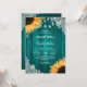 Convites de casamento floral teal rústico inspirados em girassóis, madeiras rústicas, burlap e rendas.