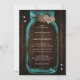 Convite de casamento teal russo com um jarro de pedras e corações de burlap em um fundo de madeira.