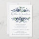 Convites para Casamento Verde Pintado (Dusty Blue): Este convite para o casamento em aquarela mostra seus nomes no topo de um lindo roteiro casual de caligrafia rodeado por verduras de casamentos cor azul empoeirada. As costas têm uma aparência falsa de conselho rústico de madeira. Não quer azul empoeirado? Você pode alterar a cor do seu texto no editor. Mude a tonalidade do verde e do design traseiro apenas mudando sua cor de fundo! #dustyblue #weddingarreas#bluecasamento #rusticWede