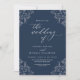 Este convite de casamento azul-marinho recentemente atualizado é elegante e elegante. Ele apresenta os cantos de vintage do ornamentado com a caligrafia vintage. Ele tem o aspecto de impressão branca no estoque de marinho azul. É perfeito para um casamento elegante e elegante.