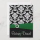 Convites para Casamentos tema damasco em preto e verde - cada convite para casamentos tema damasco apresenta um invólucro impresso em volta da fita verde com um embelezamento de fivela redonda de diamante para um toque feminino adicionado. Abaixo da fita impressa, a metade inferior é preta. Acima da fita, na metade superior de cada convite, aparecem as vitrines e a impressão elegante de uma umidade preta e branca. O design envolve a parte traseira e apresenta o mesmo design com uma caixa de texto elegante sombreada em um verde muito claro para fazer o pop de texto sair. A caixa de texto também permite que os gráficos pesquisem o floco adicionado. O tipo de papel é definido como existências de convite básicas; entretanto, você pode mudar o tipo de papel para linho, feltro ou metálico sob o botão laranja personalizar abaixo da demonstração de convite. Cada convite vem com um envelope branco.