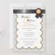 Lindos convites com cinza de urze e cor damasco branca e design de fita preta com laranja no topo.
