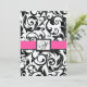 Convites a Casamentos tema damasco pretos e cor-de-rosa—correspondem às placas RSVP e mais encontram-se abaixo nesta página. Cada convite apresenta um impressão de folha floral em preto sobre um fundo branco. A parte frontal e traseira também apresenta uma banda rosa quente aparada em preto com um monograma quadrado que você pode personalizar para o sobrenome inicial do noivo. Estes convites para o casamento são feitos com um cartão básico de alta qualidade; entretanto, você pode mudar o estoque para linho, feltro (gravado), reciclado e várias tonalidades metálicas se quiser com o número 2 (escolha seu estilo, tamanho e tipo de papel) abaixo do botão laranja adicionar ao carrinho. Também nessa opção é apresentada uma lista dos custos adicionais de uma reserva de cartão mais antiga. Cada convite tem um envelope branco.