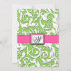 Convites para Casamentos tema damasco de cor-de-rosa e Verde limão—correspondem às placas RSVP e mais encontram-se abaixo nesta página. Cada convite apresenta um impressão de folha floral em branco sobre um fundo verde limão. A parte frontal e traseira também apresenta uma banda rosa quente com um monograma quadrado que você pode personalizar para o sobrenome inicial do grupo.