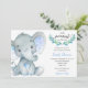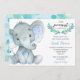 Elefante de aquarela pastel em azul, cinza e verde para o convite para chás de fraldas de menino.