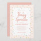 Um convite de chá de fraldas de aspersão para bebês brancos que apresenta bordas de aspersão arco-íris num fundo cor-de-rosa pincelado.