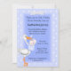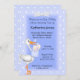 Fundo de ponto azul com uma cegonha com garotos gêmeos. Adicione os detalhes da sua festa para personalizar o convite perfeito para o chá de fraldas.
