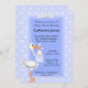 Um passado azul com uma cegonha com um bebê. Adicione os detalhes da sua festa para personalizar o convite perfeito para o chá de fraldas.
