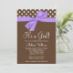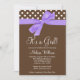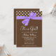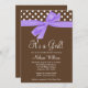 Um convite na moda roxo e chá de fraldas marrom. Apresentando bolinhas e um gráfico de arco roxo. Perfeito para um chá de fraldas de menina. Trendy e fofo! Designs são ilustrações/gráficos impressos em formato plano - NÃO É VERDADEIRO.