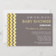 Convites personalizados para bebês em estilos elegantes e modernos amarelo-sol brilhante, cinza de carvão escuro e padrão de listras retrô chevron zigzags branco. Personalizável com seu texto, entre em contato conosco para solicitar uma alteração de cor.