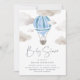 Celebre seu doce bebê no caminho com este convite chico e simples de chá de fraldas em aquarelas azuis suaves. Design apresenta uma ilustração do balão de ar quente flutuando em meio a nuvens de fluffy, com os detalhes do evento abaixo na inscrição da cinza azul enfumaçado.