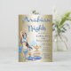 Noites árabes convites de festas com belas ilustrações azuis e douradas sobre um fundo de ouro pálido. Esta maravilhosa festa de aniversário da noite árabe e este convite para eventos é facilmente personalizado para o seu evento simplesmente adicionando os seus detalhes. Este é um design impresso sem brilho real, folha de alumínio, etc.