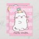 Um convite com um rabisco de um gatinho branco fofo que está vestindo uma festa bolinhas que suga seus hóspedes para uma festa de aniversário divertida do gato! O confete branco e azul está chovendo no gato. No verso estão o balão de impressão de pata de gato, o balão de bolinhas e o pequeno bolo de aniversário com vela. Um fundo rosa estripado. A paleta colorida de tons brancos, cor-de-rosa, pastel, cor-de-rosa, azuis e amarelas torna isso mais adequado para as meninas de aniversário, especialmente aquelas que amam gatos e gatinhos! Personalize seus detalhes de festa de aniversário no espaço disponível.