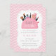 Convide os amigos da aniversariante para uma diversão feminina enquanto fazem o cabelo e a maquiagem e têm uma transformação fabulosa! Design apresenta uma ilustração de um cheio de maquiagem cor-de-rosa de artigos de maquilhagem, tais como escovas, loção, cavilha, pente, rímel e batom. Padrão de ziguezague cor-de-rosa doce pastel para fundo. Personalize facilmente com os detalhes do seu partido.