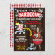 Convites de festa de churrasco e piscina de madeira rústica. Caracteriza uma churrasqueira vermelha, bebida frutada e respingos de água, O verso tem um padrão xadrez vermelho e mais respingos de água. Ótimo para festa de aniversário de verão, noivado ou formatura de adultos.