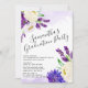 Um design floral Boho Chic inclui peões brancos cremosos, flores roxas e folhas verdes. Uma lavagem de aquarela púrpura suave define a parte superior e inferior do convite para festa de formatura. A festa de formatura e o nome do formando são escritos em letra de quadril e de tendência e colocados na diagonal. Os detalhes da festa de formatura são escritos em uma fonte simples. Muito fácil de ler e editar. O fundo do convite é um roxo profundo.