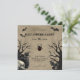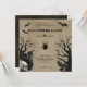 Convites para Festas de Halloween Rustic. Cartas quadradas. Árvores assustadoras, morcegos, corvos, viúvas pretas, crânio, rosas e teias de aranha, todos em fundo rústico.